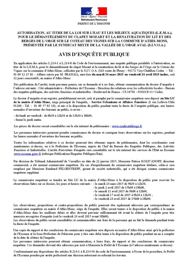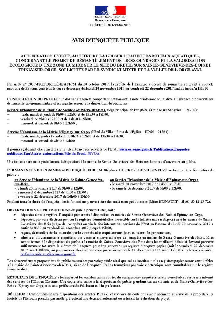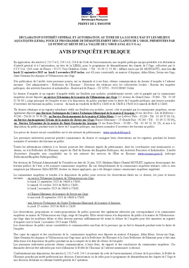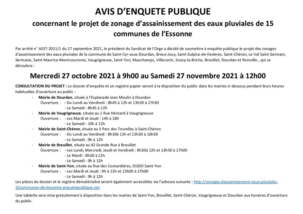 2 octobre 2021 Avis d’enquête publique concernant le projet de zonage d’assainissement des eaux pluviales de 15 communes de l’Essonne