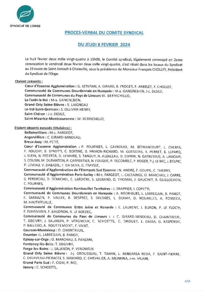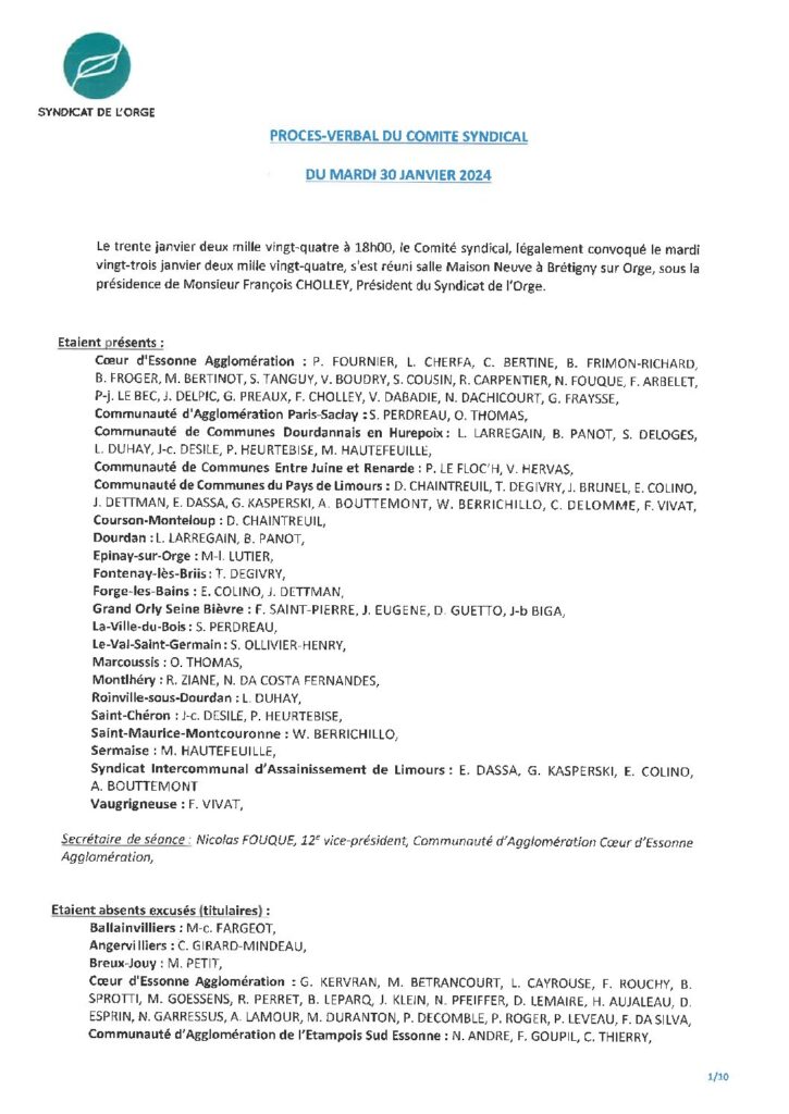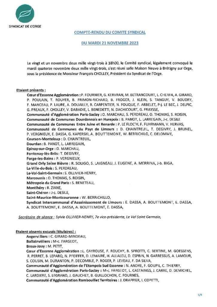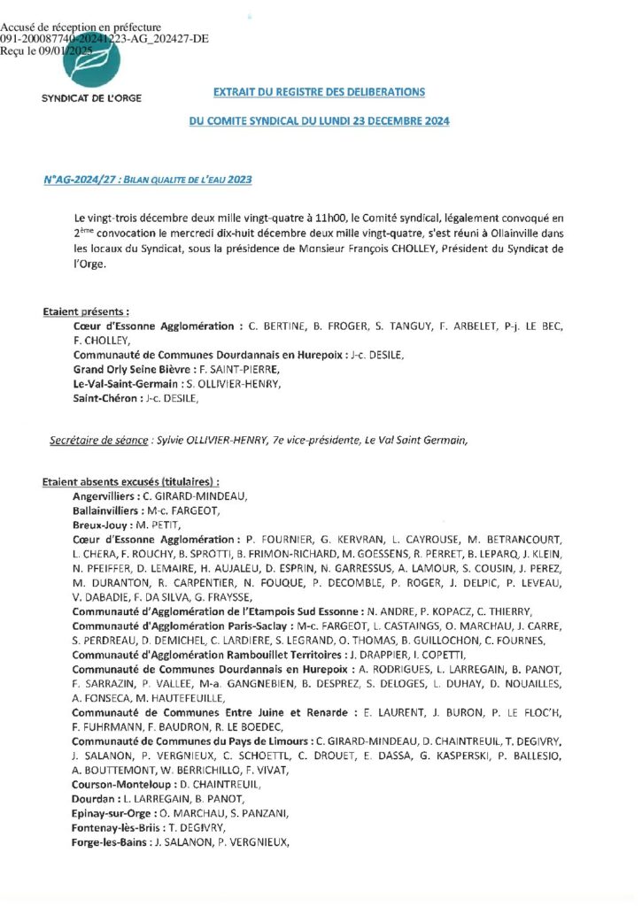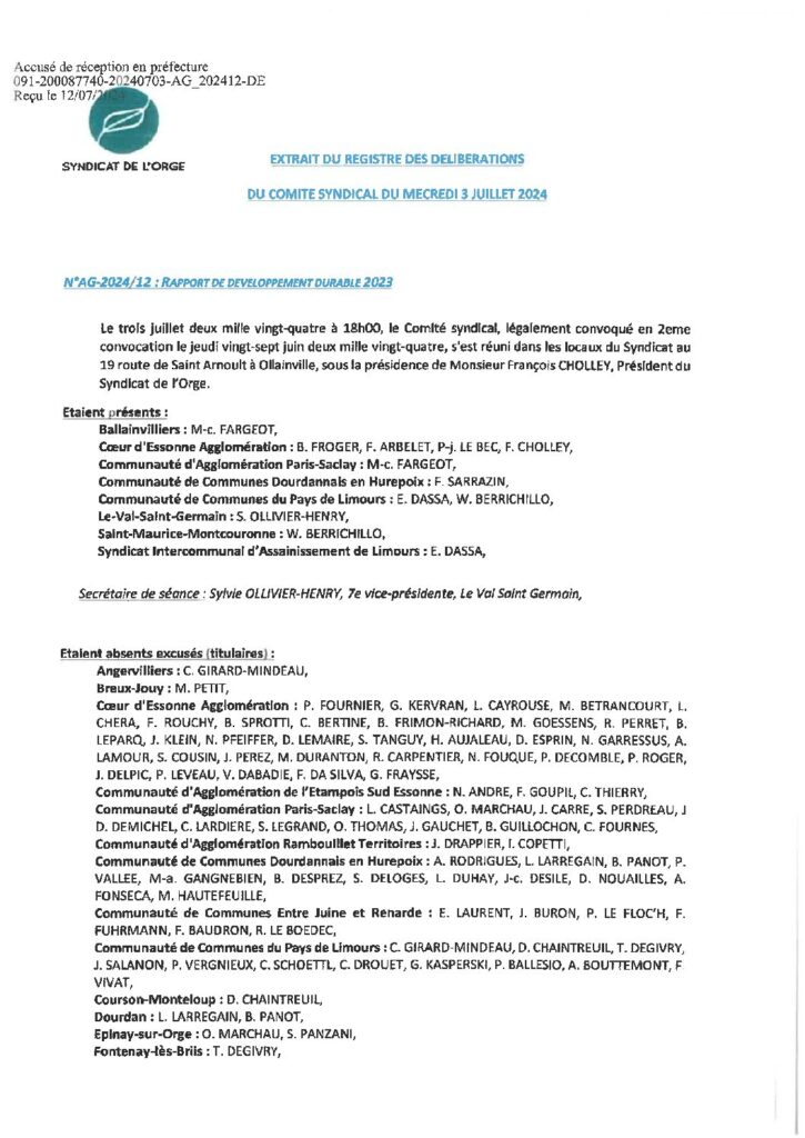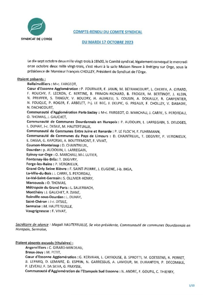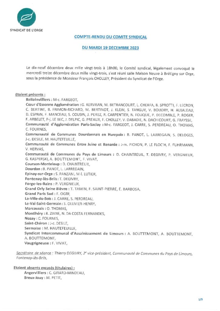 Résumé : Vote des comptes administratifs Rivière, Régie, Collecte, Assainissement, et affectations des résultats Adhésion au Syndicat Essonne Numérique Bilan…
